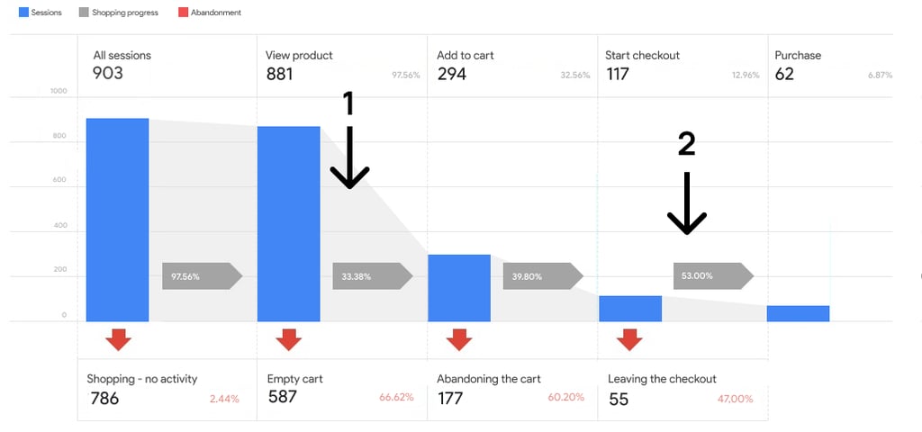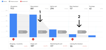 Main stages where users left the store were after viewing a few products (1) and during checkout (2).