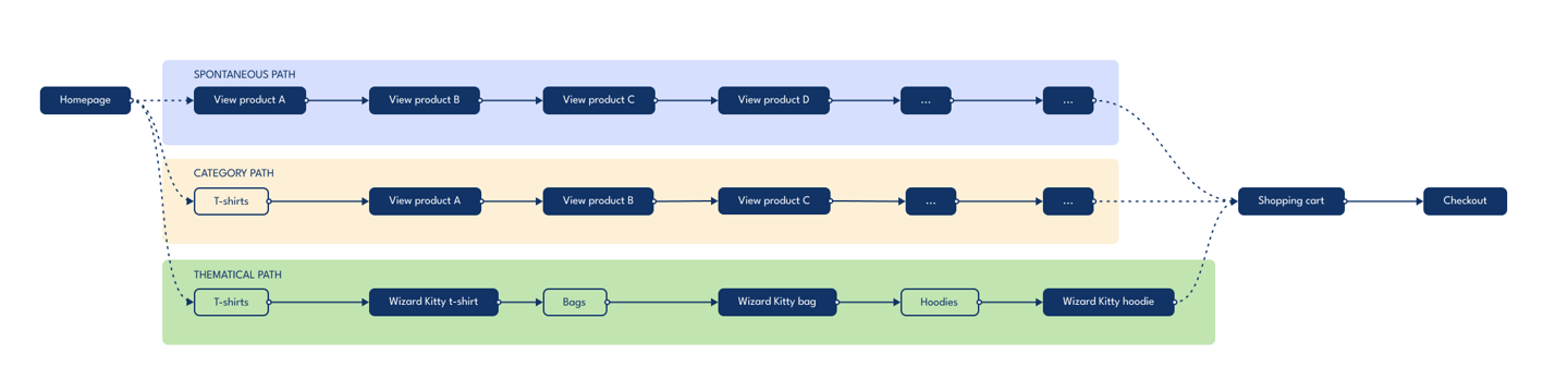 Reverse path exploration helped us determine 3 main pathways of content viewing leading up to checkout. For example, we noticed some customers were looking at items with similar themes, but located within different categories. This could be used to build thematic lists or suggestions.