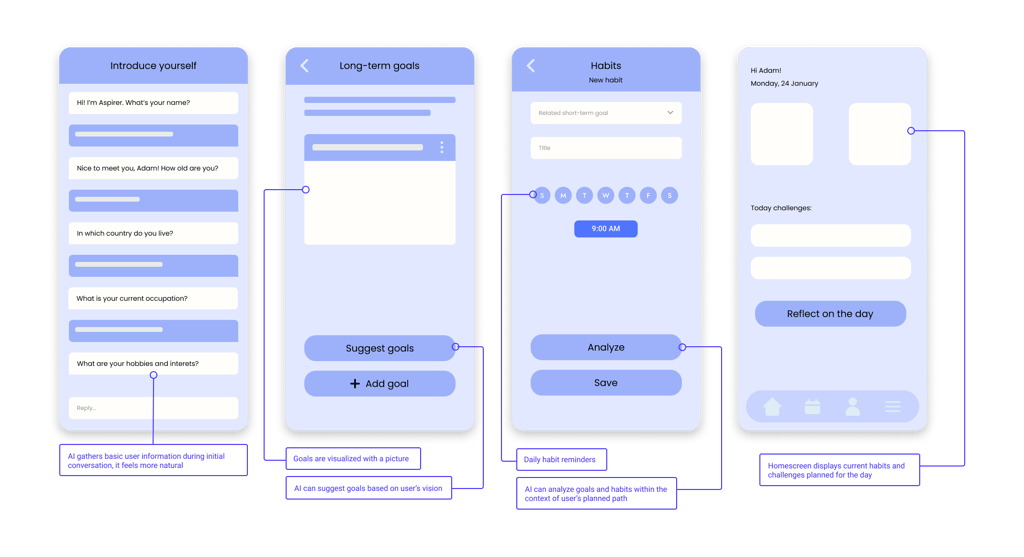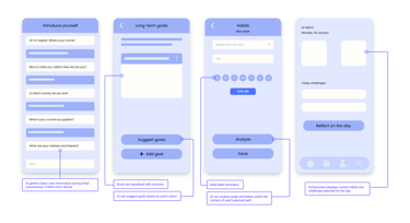 Seeing how AI interaction is designed in competitors' products I wanted Aspirer to have some predefined chat options and several AI behavior styles (for quick actions and more personalization), but it was considered very time-consuming and we went ahead with full user-input system and one default "personality". Habit planners delivered inspirations for motivation building and interaction design.