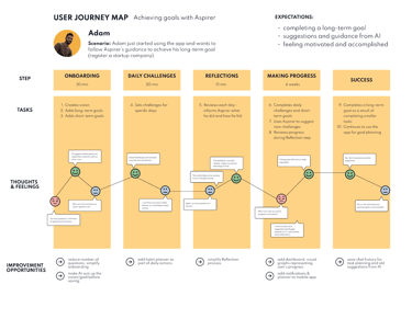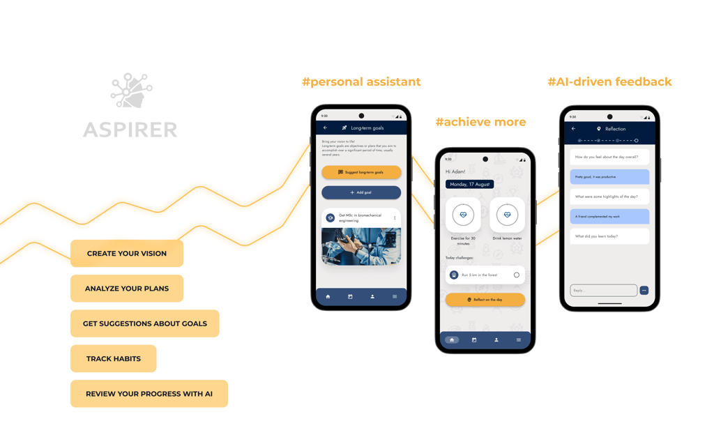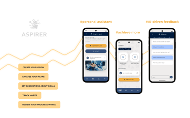 It was a challenge to design a UI for a tool like this because there aren't many apps that resemble Aspirer. I wanted to simplify processes even more and offer a user experience closer to modern habit tracker apps. I discovered how limited AI chatbots are and what to watch out for when incorporating such a feature in a product. Again, tests showed that simplicity and speed are core values for mobile users. It takes a lot of research to design a mentoring/coaching app and persuade users to actually take their time when interacting with it. Despite disagreements we had great vibe within the team and really wanted to make it work.