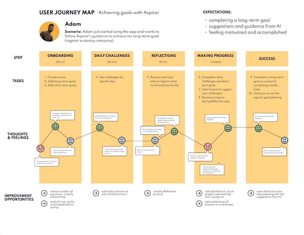 I thought it was a perfect opportunity to map the whole process as a User Journey in order to feel users' emotions, compare MVP against initially defined deliverables and find points for improvement.
