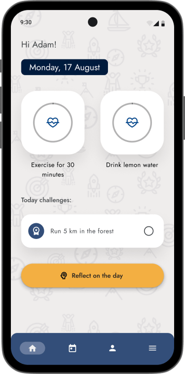 User can complete habits and challenges directly from this screen and sum up their day via Reflections