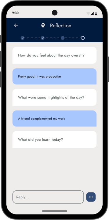 Reflection can be done at the end of each day - user marks tasks as completed and AI asks questions about user’s wellbeing and progress