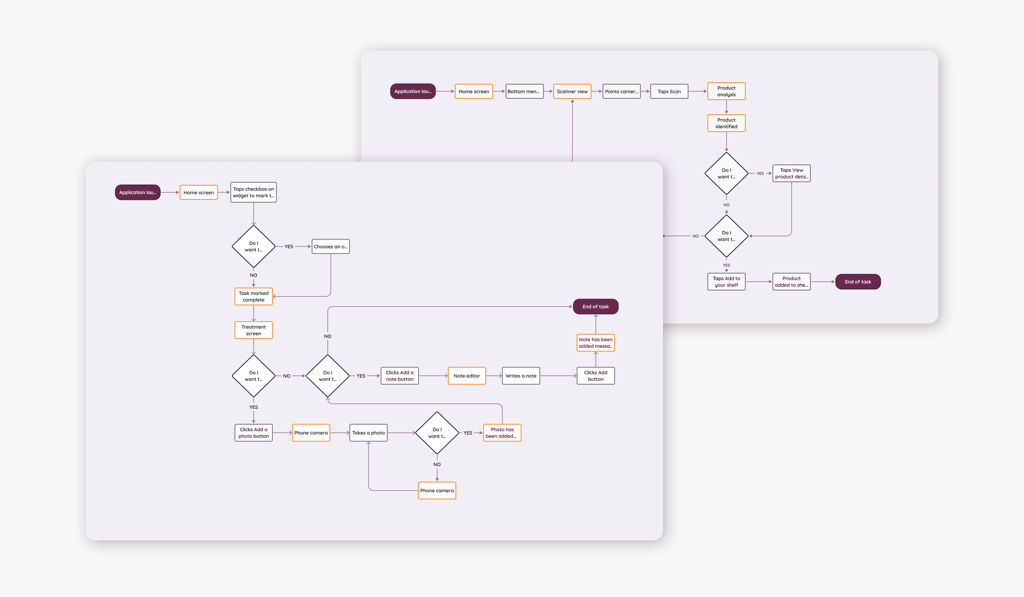 Having decided on MVP features, I designed basic user scenarios. During modeling stage I developed each of user scenarios into a user flow diagram and wireframe sketches. This helped me to discover new correlations, needs or blind spots that needed correction. Next, a prototype was designed in Figma and presented to users for testing.