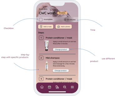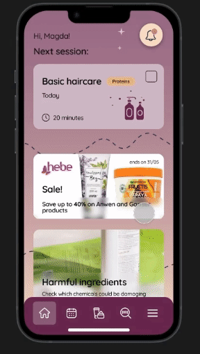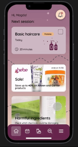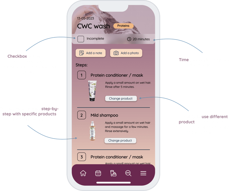 Monthly and weekly view show the planned treatments. Each treatment comes with a short guide and predefined products. When completing treatments user can rate their hair condition and add a photo/note - this way user keeps a record of their haircare journey and tracks improvement.
